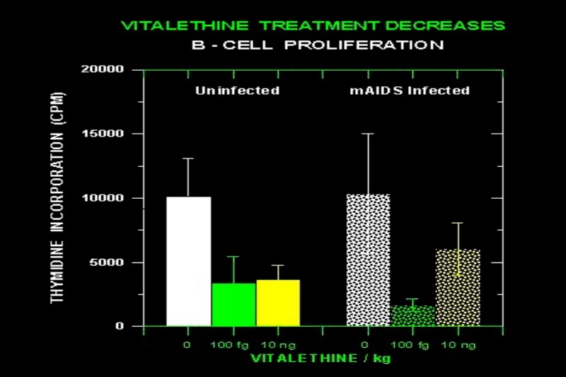 Critical to fighting cancers, especially of the leukemia and lymphoma variety, is the ability to put the brakes upon cancer cell division. Even though antibodies are being cranked out in response to vitalethine in both the infected and uninfected mice, the division (proliferation) of the B cells that make these antibodies is severely restricted by vitalethine. This is ideal from the standpoint of being applicable to several types of cancer, since one can slow growth while generating antibodies at much higher rates, that will hopefully adapt and become specific enough to kill only the cancers cells. Beta-alethine actually caused huge myelomas (B-cell cancers) to regress, indicating that it is possible for good B cells to make antibodies tp kill bad B-cells (NS-1 myeloma cells).
